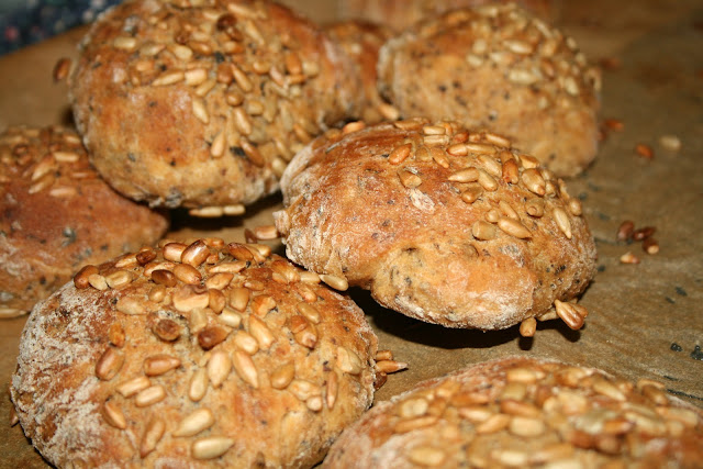 * Leivo taikinasta sämpylöitä, kohota liinan alla noin 15-20 min. Ripottele kohonneiden leipien pinnalle siemeniä. Siemenet tarttuvat leipään paremmin jos sekoitat ne vesitilkkaan, ja ripottelet ne kosteana leivän pinnalle.